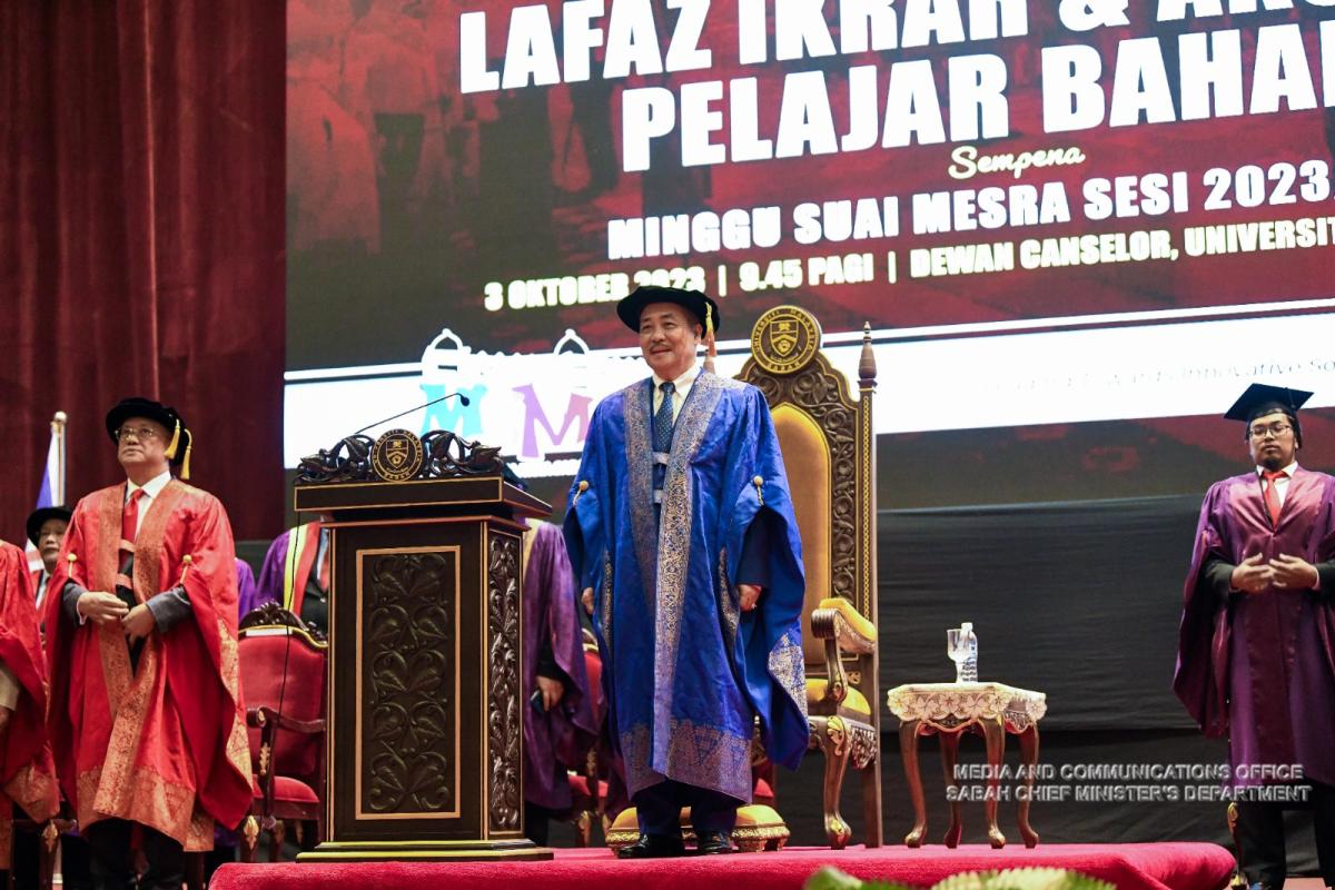 Yang Amat Berhormat Ketua Menteri Menyempurnakan Majlis Ikrar dan Aku Janji Sempena Minggu Suai Mesra Sesi 2023/2024 Kali ke-29 Universiti Malaysia Sabah (UMS) yang Berlangsung di Dewan Canselor, Universiti Malaysia Sabah (UMS)
