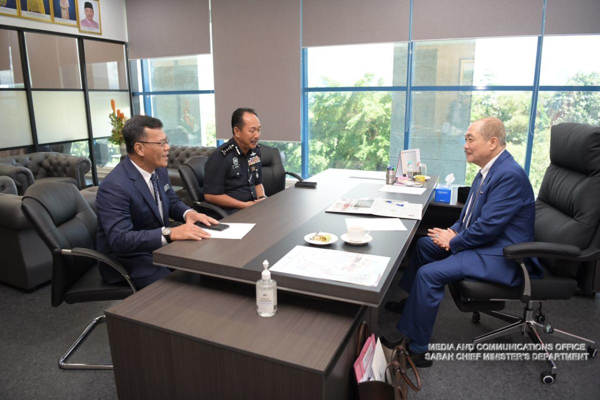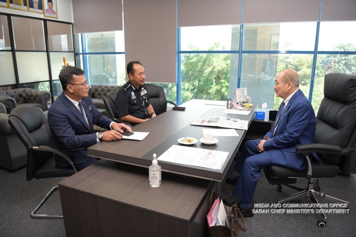 Yang Amat Berhormat Ketua Menteri menerima Kunjungan Hormat daripada Pesuruhjaya Polis Sabah, Yang Dihormati Datuk Jauteh bin Dikun, dan Ketua Cawangan Khas, Datuk Mohd Salleh B. Yahya di Pejabat Ketua Menteri, Bangunan Dewan Undangan Negeri Sabah
