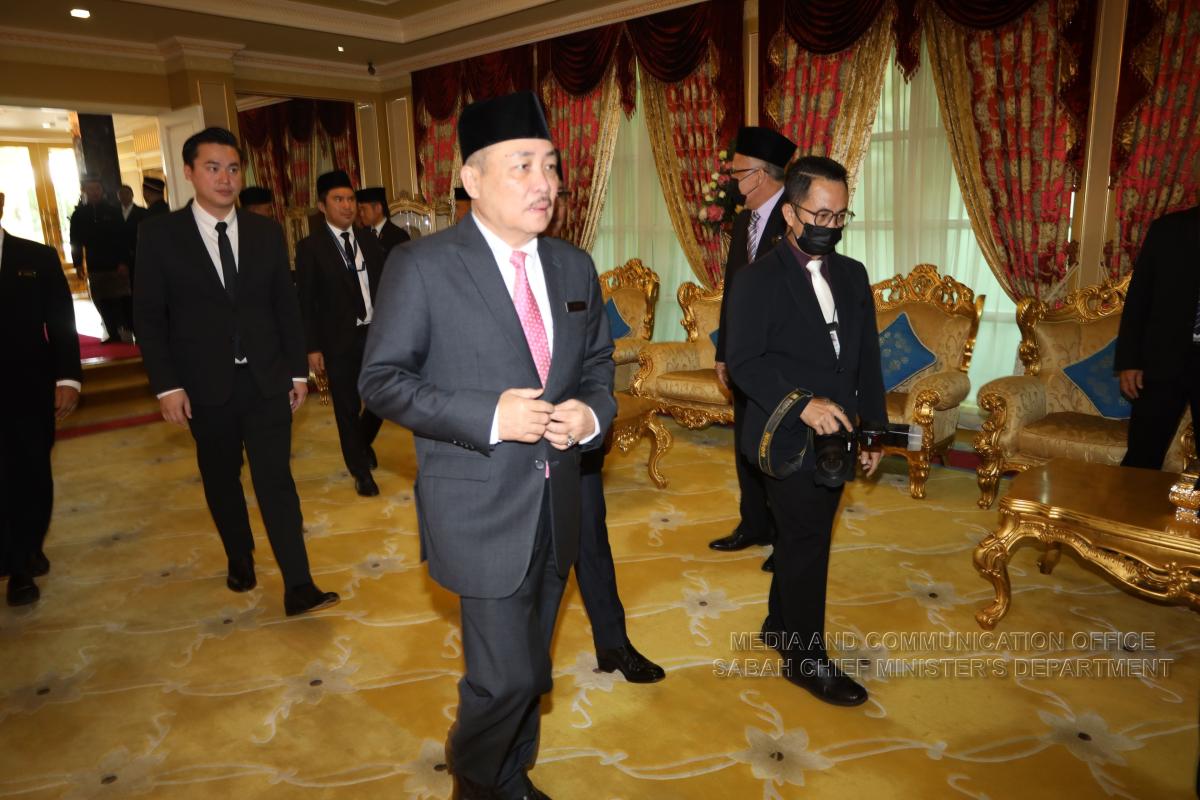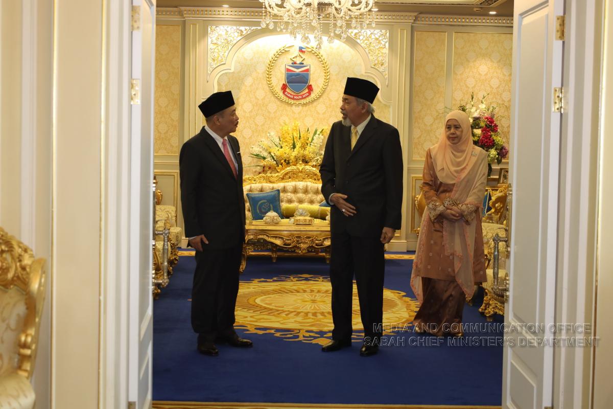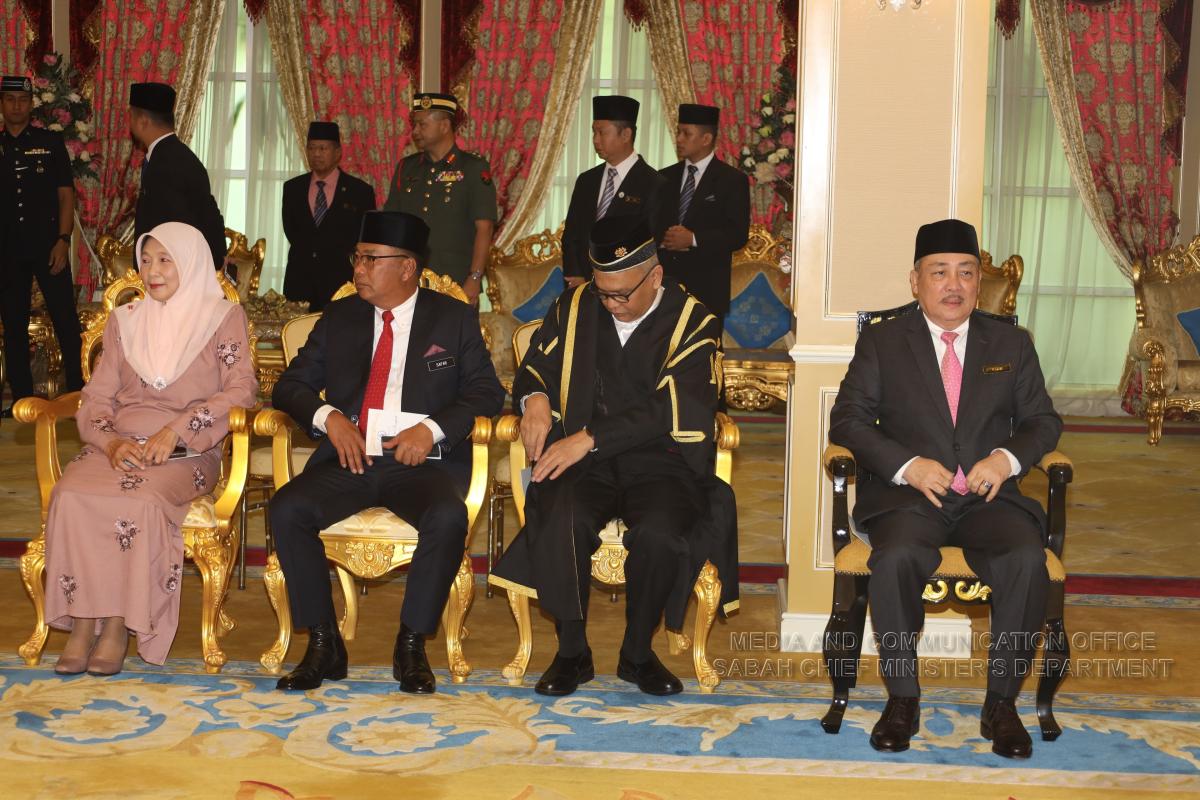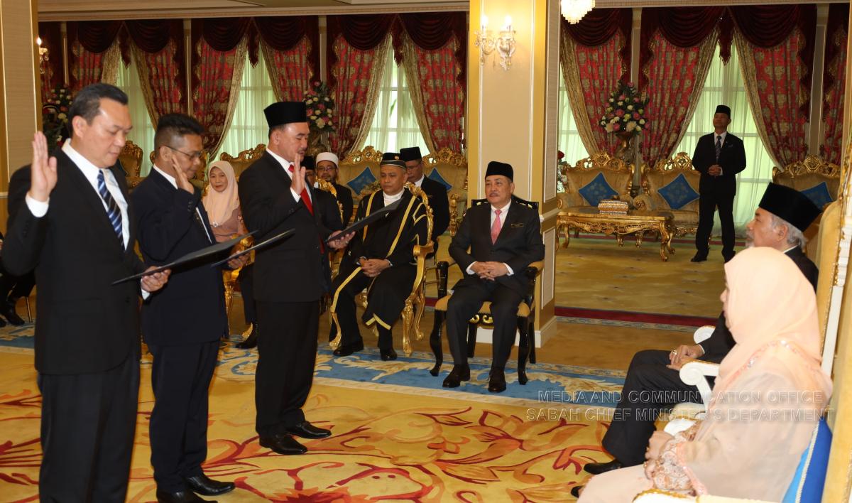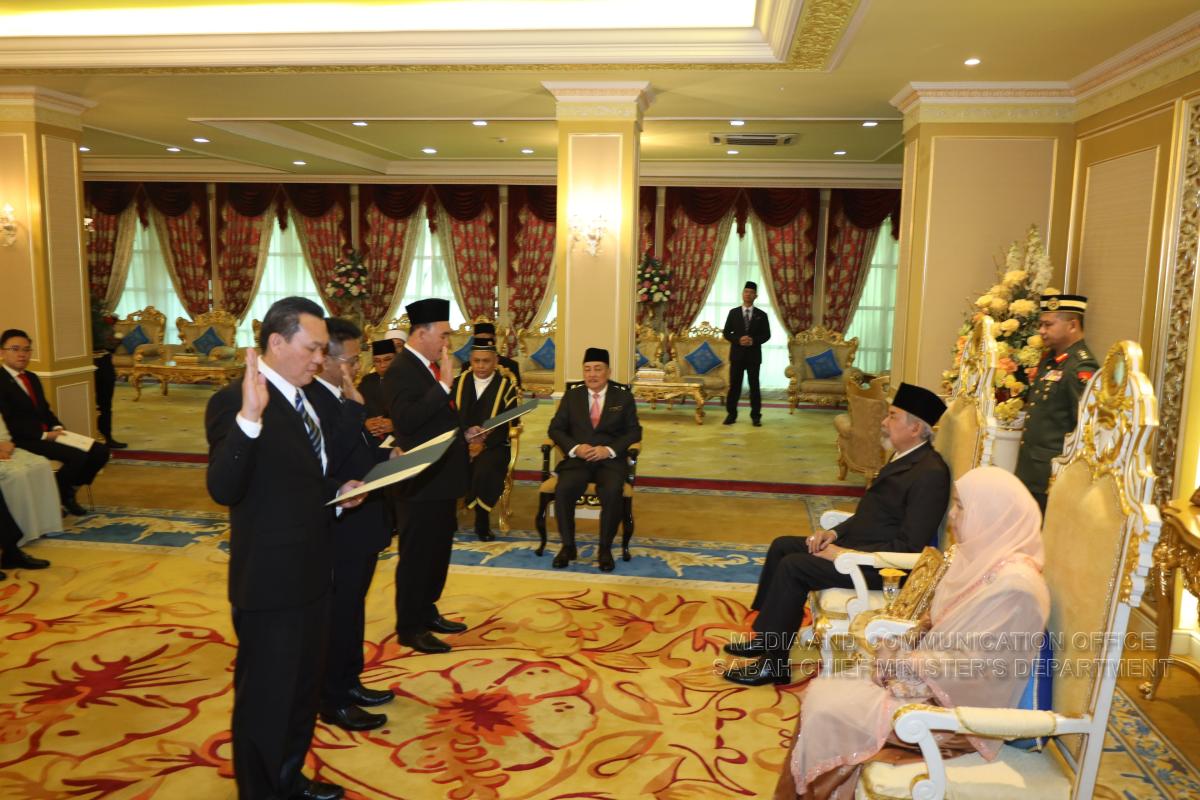 Yang Amat Berhormat Ketua Menteri menyaksikan tiga Pembantu Menteri Baharu mengangkat sumpah di hadapan Yang Dipertua Negeri Tun Juhar Mahiruddin di Istana Seri Kinabalu