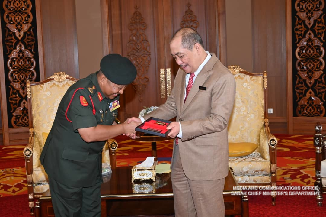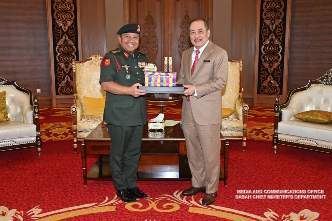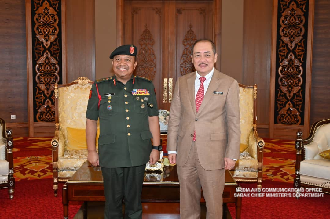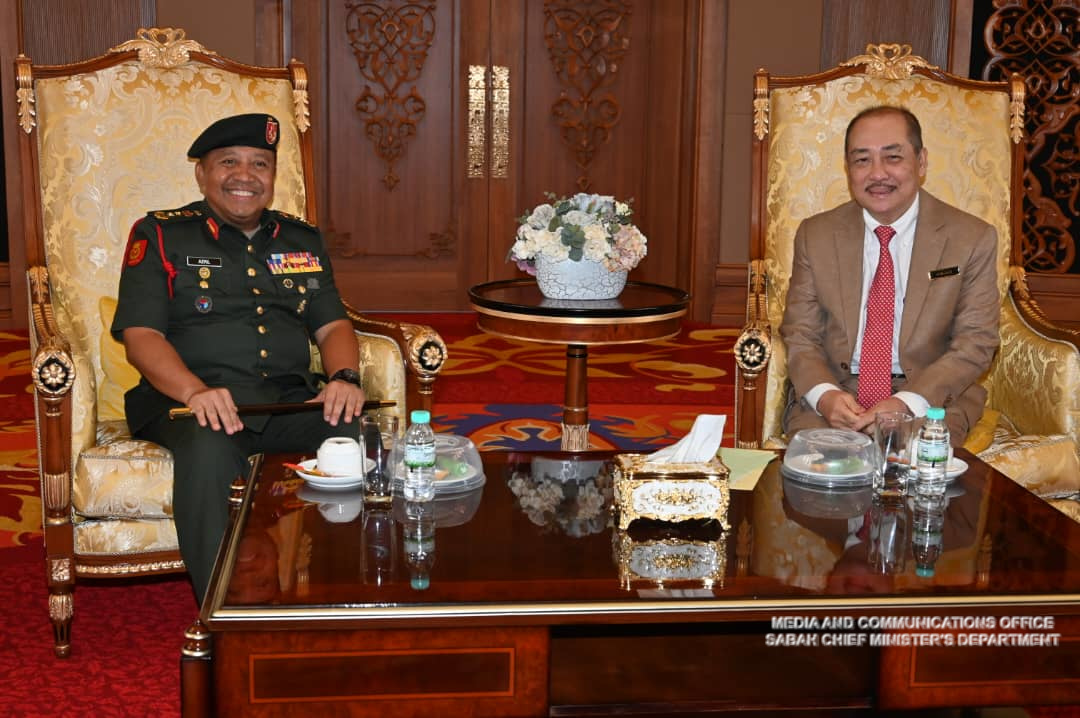 Yang Amat Berhormat Ketua Menteri menerima Kunjungan Hormat daripada Panglima Lima Divisyen, YBhg Mejar Jeneral Dato’ Haji Noorrul Azril bin Ariffin di Pejabat Ketua Menteri, Menara Kinabalu