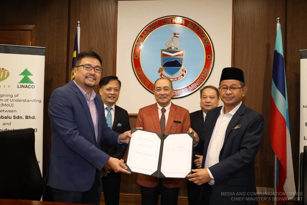 Datuk Seri Panglima Haji Hajiji Haji Noor menyaksikan proses menandatangani Memorandum Persefahaman (MoU) antara Linaco manufacturing (M) Sdn Bhd & Sawit Kinabalu mengenai penyewaan semula tanah anak syarikat Sawit di Langkon, Kota Marudu untuk kilang kelapa bersepadu skala penuh.