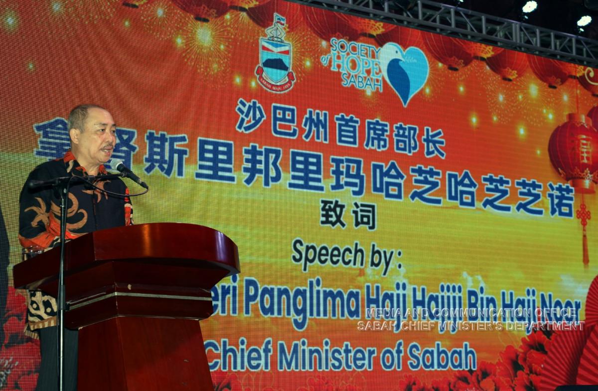 Yang Amat Berhormat Ketua Menteri merasmikan Majlis Makan Malam Amal Persatuan Sumber Harapan Sabah Sempena Sambutan Tahun Baru Cina 2023 di Dewan Hakka, Kota Kinabalu