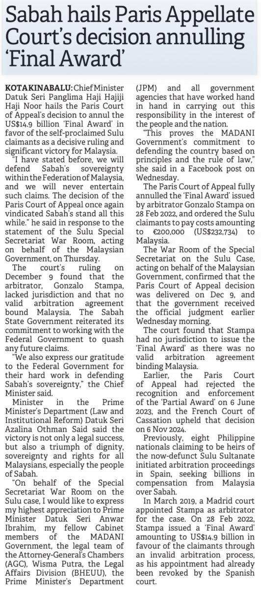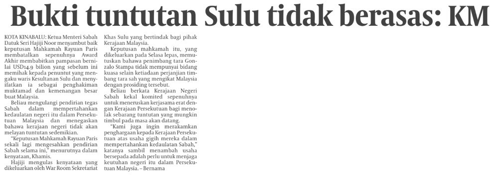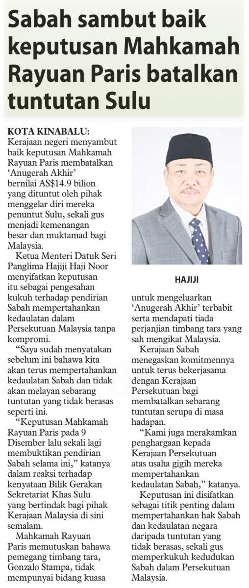 Sabah sambut baik keputusan Mahkamah Rayuan Paris batalkan tuntutan Sulu