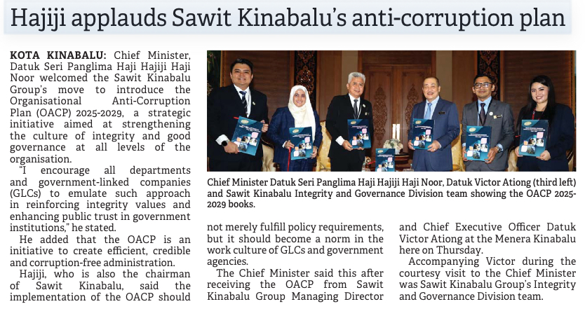 Hajiji applauds Sawit Kinabalu's anti-corruption plan