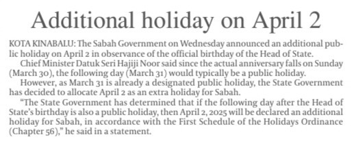 Additional holiday on April 2
