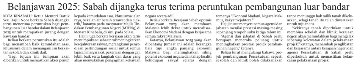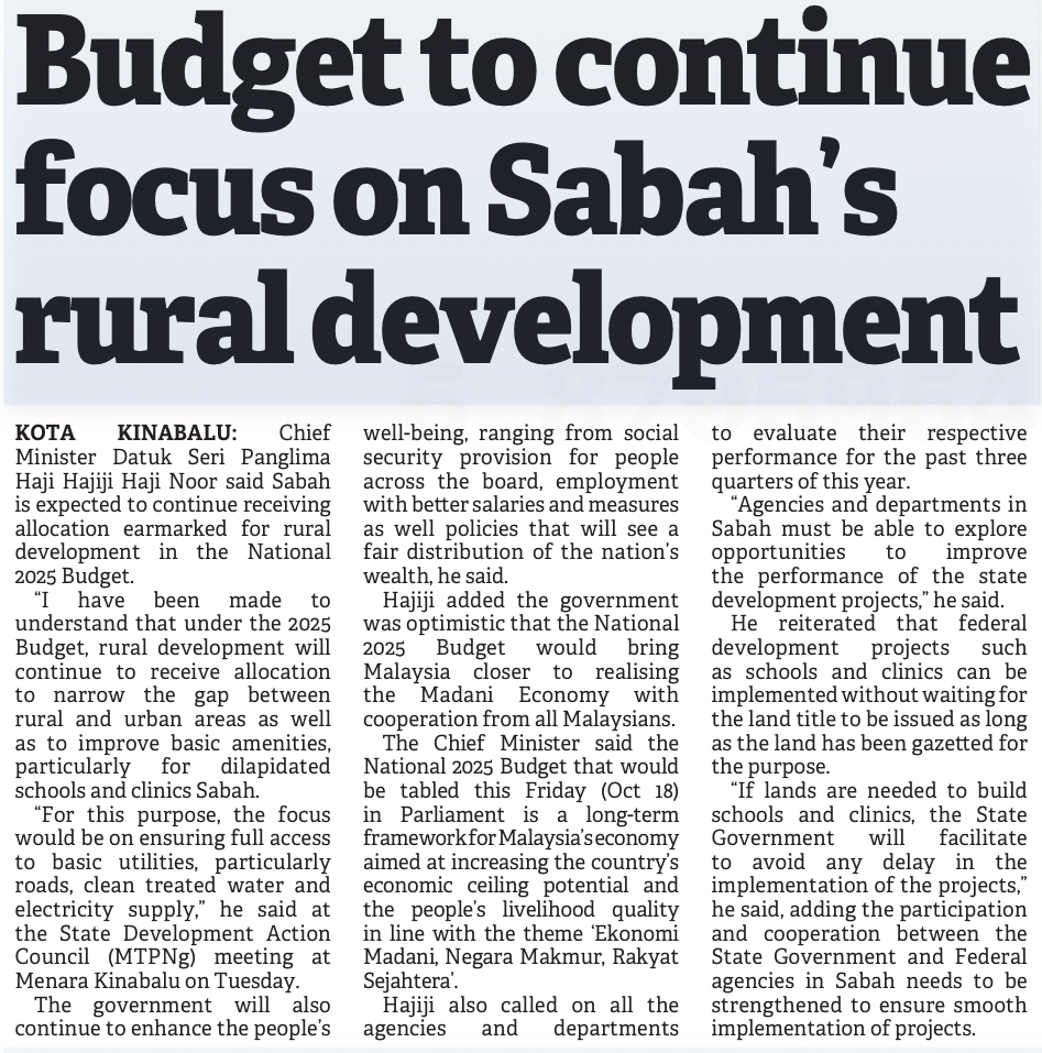 Belanjawan 2025: Sabah dijangka terus terima peruntukan pembangunan luar bandar