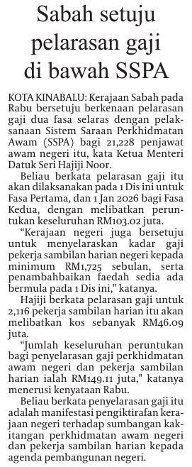 Sabah setuju pelarasan gaji di bawah SSPA