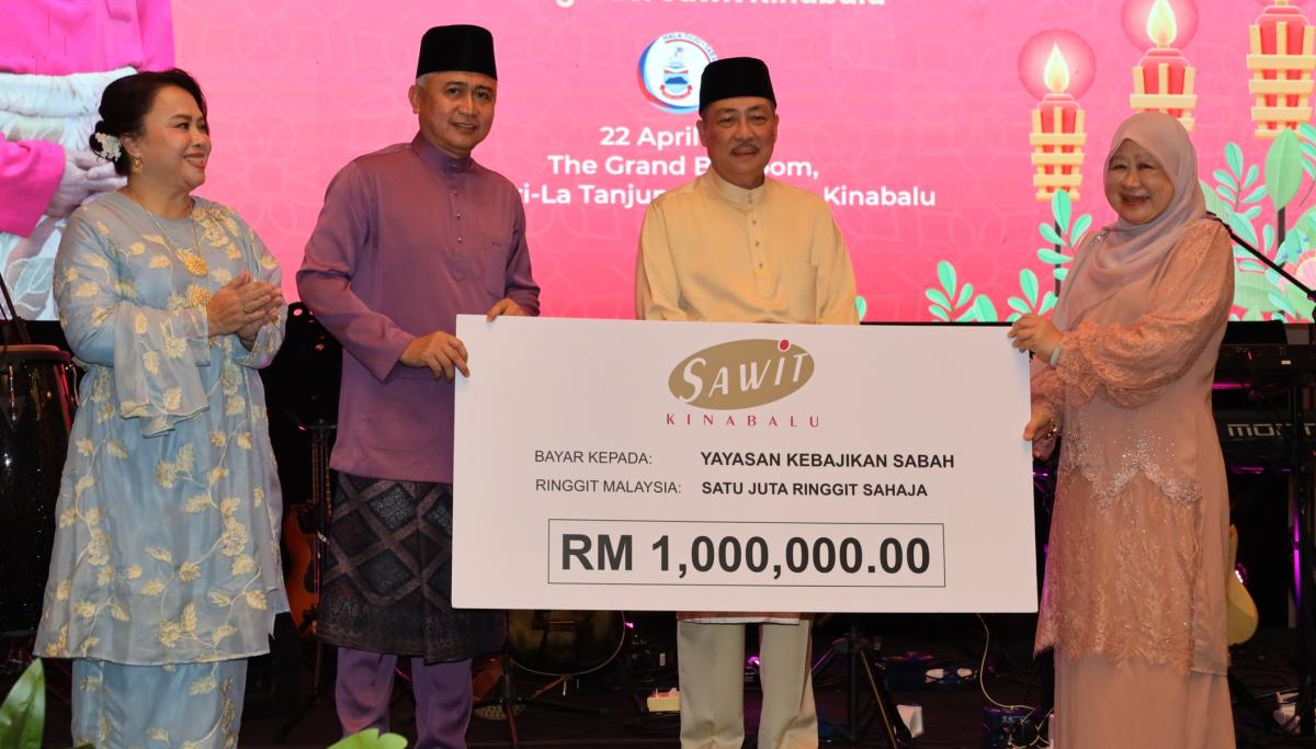 KOTA KINABALU: Kumpulan Sawit Kinabalu menyumbang RM1 juta kepada Yayasan Kebajikan Sabah (YKS) sempena Majlis Rumah Terbuka Aidilfitri di Shangri-La Tanjung Aru Resort, di sini hari ini.