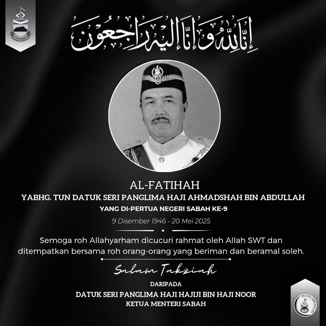 “Bagi pihak kerajaan Negeri, saya mengucapkan takziah kepada keluarga mantan Tuan Yang Terutama Yang di-Pertua Negeri Sabah, Tun Datuk Seri Panglima Ahmadshah bin Abdullah yang meninggal dunia di Hospital KPJ pada Selasa.