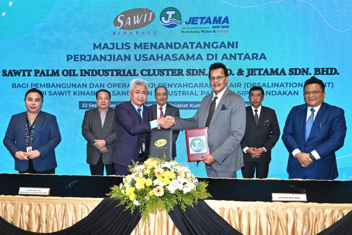 KOTA KINABALU: Ketua Menteri, Datuk Seri Panglima Haji Hajiji Haji Noor hari ini menyaksikan majlis menandatangani Perjanjian Usahasama antara Sawit Palm Oil Industrial Cluster Sdn. Bhd. (SPOIC), anak syarikat Kumpulan Sawit Kinabalu, dengan Jetama Sdn. Bhd. (JSB) bagi pembangunan Loji Penyahgaraman Air berkapasiti dua juta liter sehari (2MLD) di Sawit Kinabalu Sandakan Industrial Park (SK SIP).