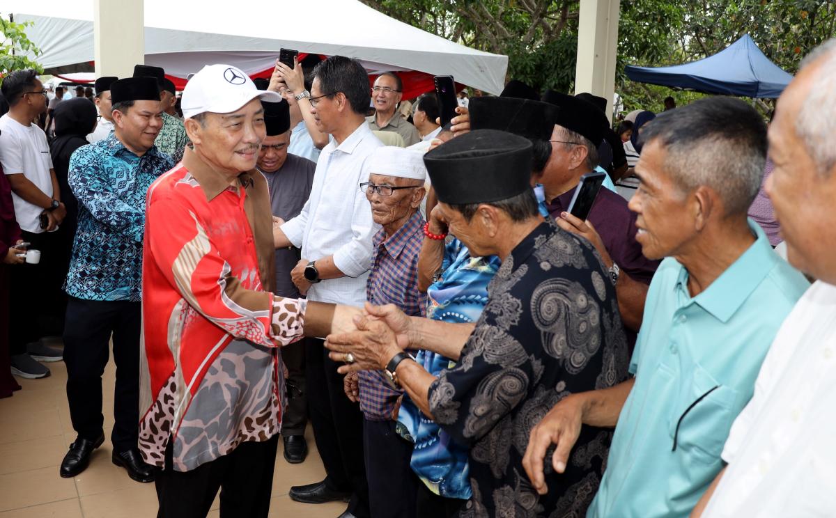 TUARAN: Ketua Menteri, Datuk Seri Panglima Haji Hajiji Haji Noor bersalam dan beramah mesra dengan tetamu yang hadir sempena Majlis Kesyukuran YAB Ketua Menteri di kediamannya di Kampung Serusup, di Tuaran, pada Jumaat. Yang turut hadir isteri Ketua Menteri, Datin Seri Panglima Datuk Hajah Juliah Salag.