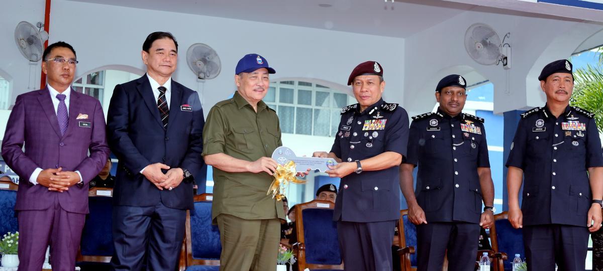 Chief Minister Datuk Seri Panglima Haji Hajiji Haji Noor presented the key replica to Inspector-General Police Dato Sri Mohd Khalid Ismail as the handing over gimmick in a ceremony at the Sabah Police Contingent Headquarters Drill Field in Kepayan near here today.
