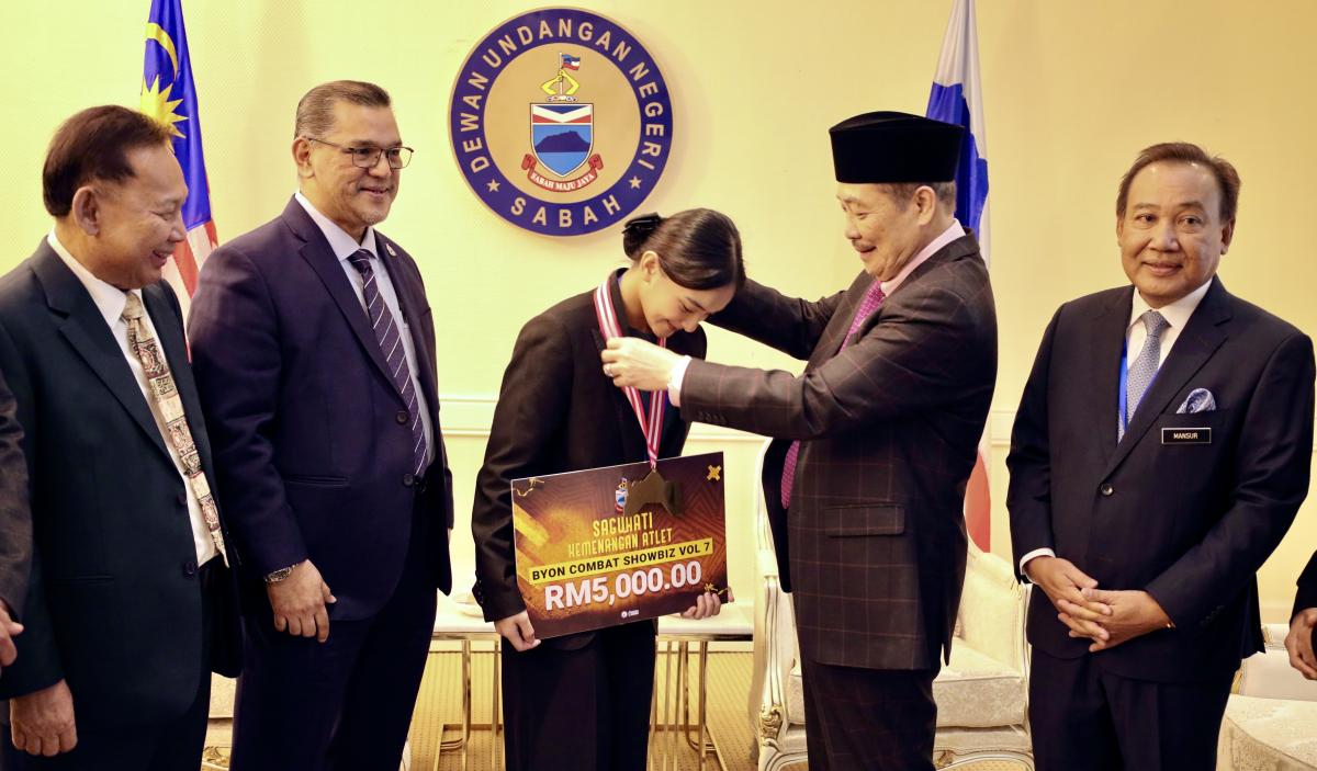 KOTA KINABALU: Ketua Menteri, Datuk Seri Panglima Haji Hajiji Haji Noor menyampaikan insentif kerajaan negeri berjumlah RM5,000 kepada atlet Muaythai Sabah, Emmabell Cassandra, sebagai pengiktirafan atas kejayaan cemerlangnya di pentas antarabangsa.